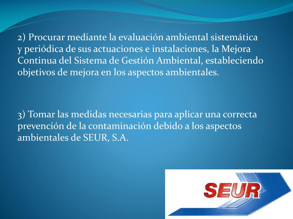 2) Procurar mediante la evaluación ambiental sistemática y periódica de sus actuaciones e instalaciones, la Mejora Continua del Sistema de Gestión Ambiental, estableciendo objetivos de mejora en los aspectos ambientales. 3) Tomar las medidas necesarias para aplicar una correcta prevención de la contaminación debido a los aspectos ambientales de SEUR, S.A.