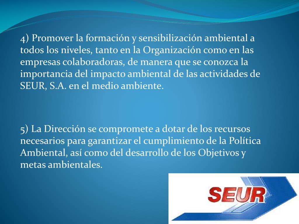 4) Promover la formación y sensibilización ambiental a todos los niveles, tanto en la Organización como en las empresas colaboradoras, de manera que se conozca la importancia del impacto ambiental de las actividades de SEUR, S.A. en el medio ambiente. 5) La Dirección se compromete a dotar de los recursos necesarios para garantizar el cumplimiento de la Política Ambiental, así como del desarrollo de los Objetivos y metas ambientales.