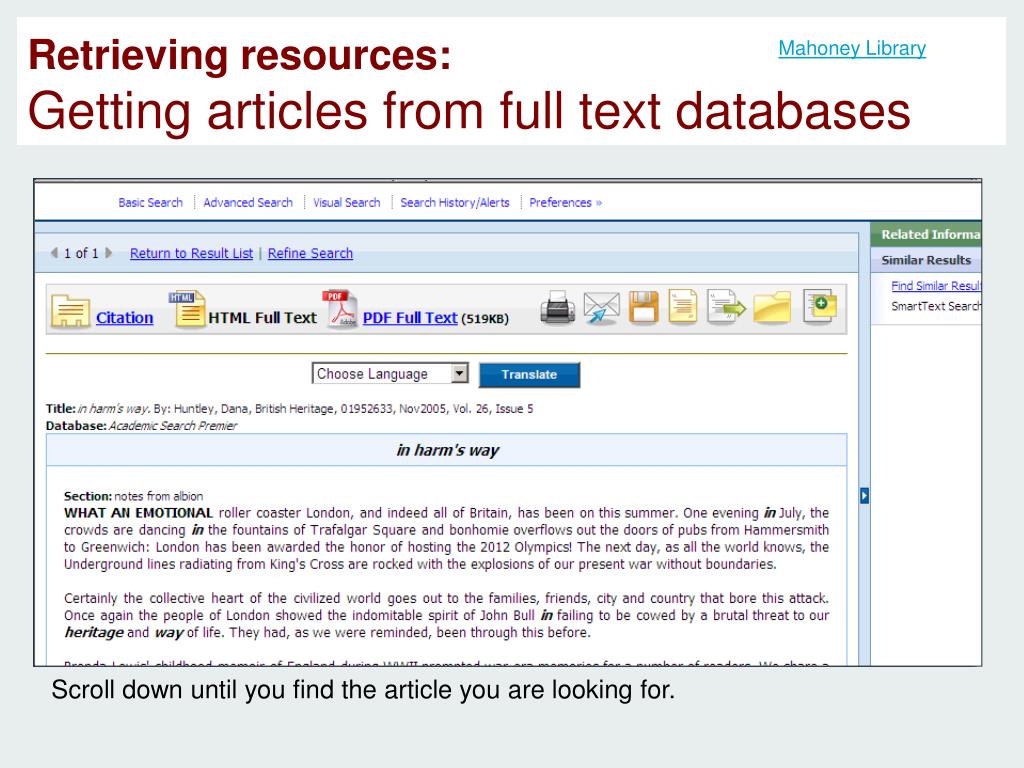 Mahoney Library Retrieving resources:Getting articles from full text databases Many databases provide the actual text of the article being searched. You will be taken to a new screen listing the databases with the full text for the journal and the range coverage they offer Simply click on the PDF or HTML link to take you to the full text. The text of the electronic version will be identical to the print version. If the full text is not provided, the database can search the other databases for the full text. Click “Search for full text” or some version of that. Click on the database providing the coverage you need. Volume & issue Scroll down until you find the article you are looking for. Click on the volume and issue to access the issues.