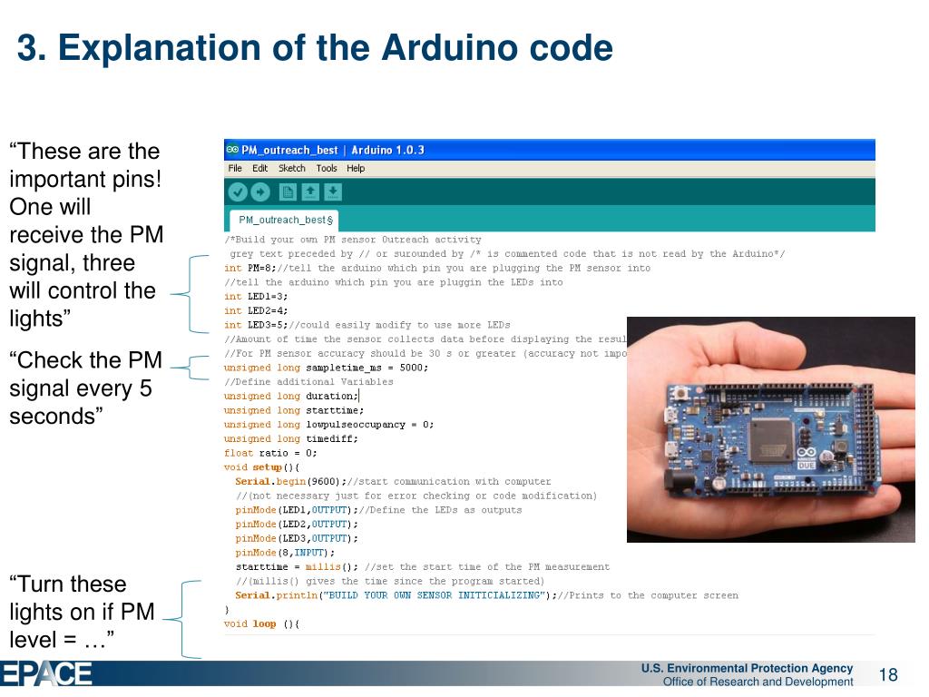 3. Explanation of the Arduino code “These are the important pins! One will receive the PM signal, three will control the lights” “Check the PM signal every 5 seconds” “Turn these lights on if PM level = …”