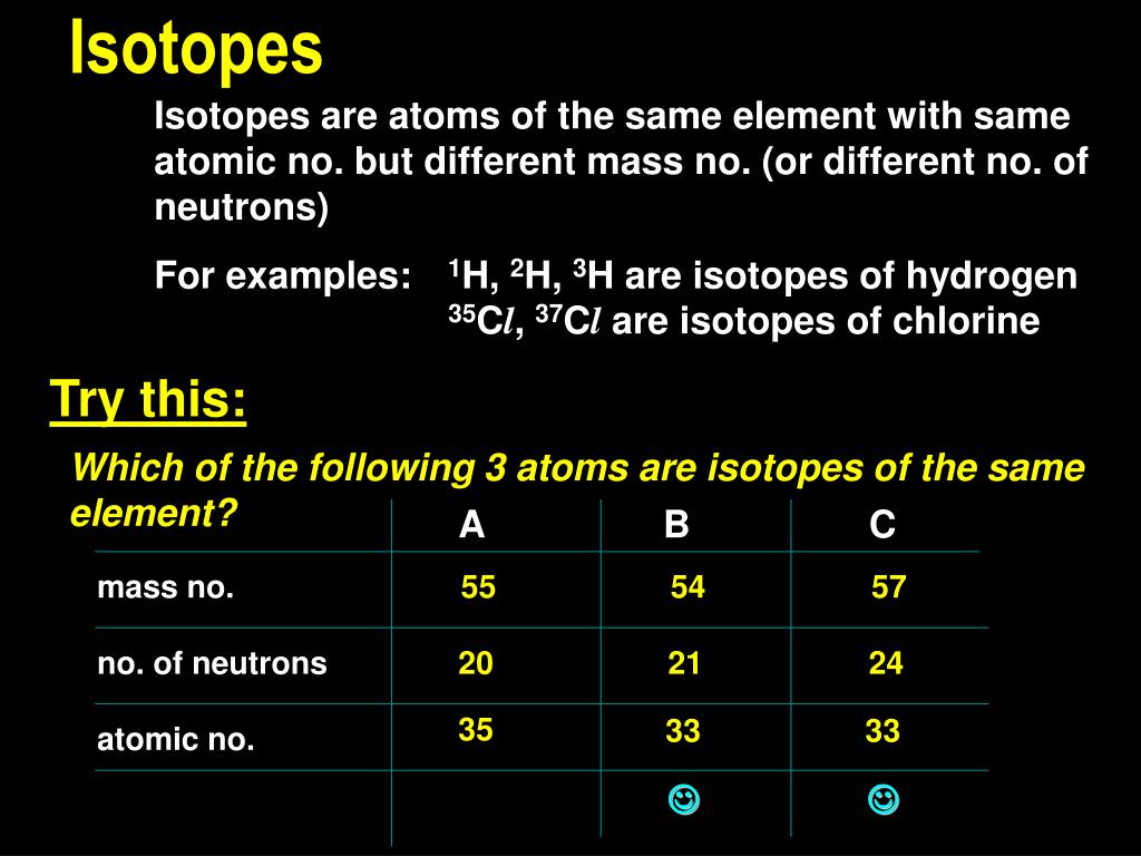 A B C mass no. 55 54 57 no. of neutrons20 21 24 atomic no. Isotopes Isotopes are atoms of the same element with same atomic no. but different mass no. (or different no. of neutrons) For examples: 1H, 2H, 3H are isotopes of hydrogen35Cl, 37Cl are isotopes of chlorine Try this: Which of the following 3 atoms are isotopes of the same element? 35 33 33