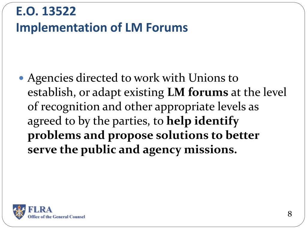 E.O. 13522Implementation of LM Forums • Agencies directed to work with Unions to establish, or adapt existing LM forums at the level of recognition and other appropriate levels as agreed to by the parties, to help identify problems and propose solutions to better serve the public and agency missions.