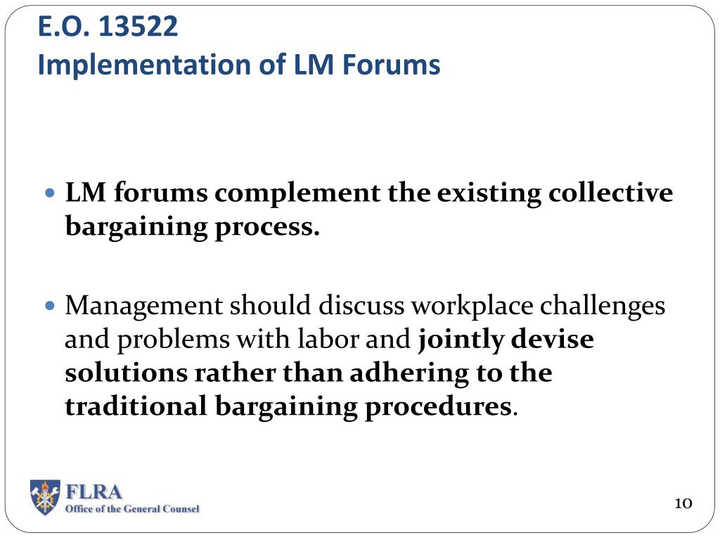 E.O. 13522Implementation of LM Forums • LM forums complement the existing collective bargaining process. • Management should discuss workplace challenges and problems with labor and jointly devise solutions rather than adhering to the traditional bargaining procedures.