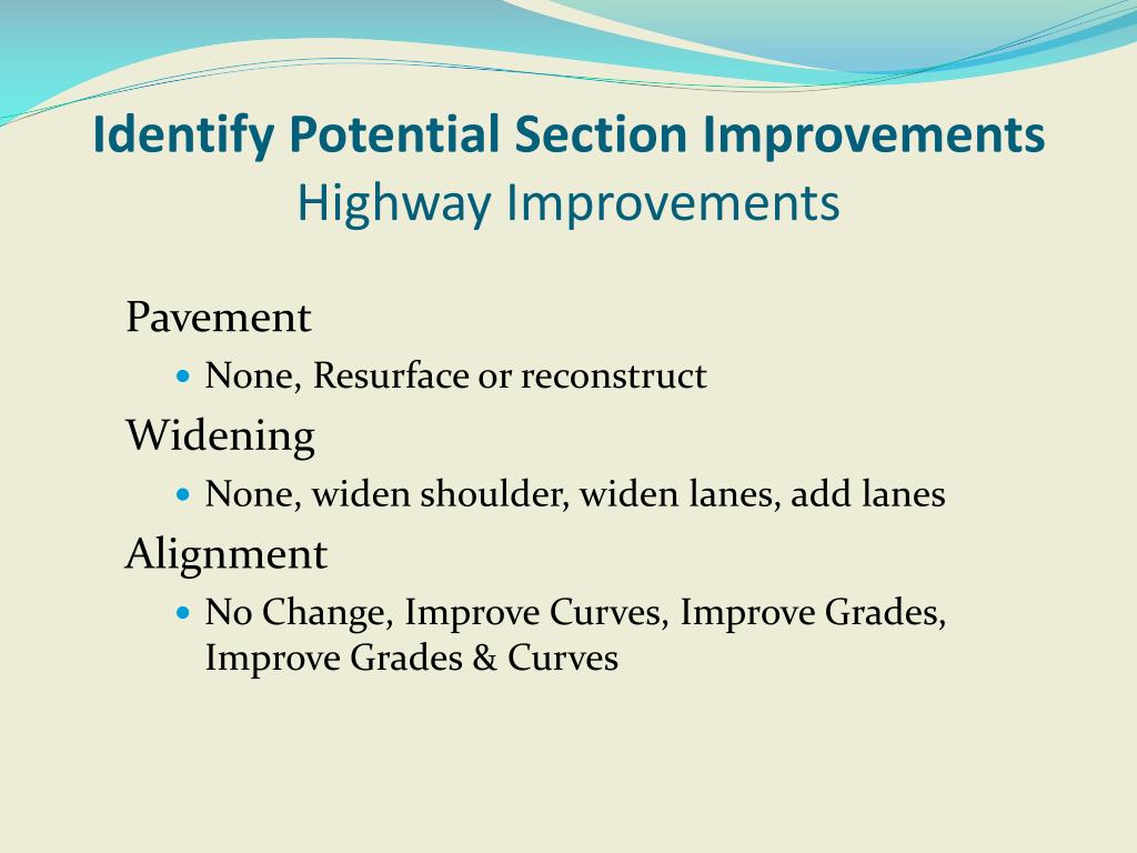 Identify Potential Section ImprovementsHighway Improvements Pavement • None, Resurface or reconstruct Widening • None, widen shoulder, widen lanes, add lanes Alignment • No Change, Improve Curves, Improve Grades, Improve Grades & Curves