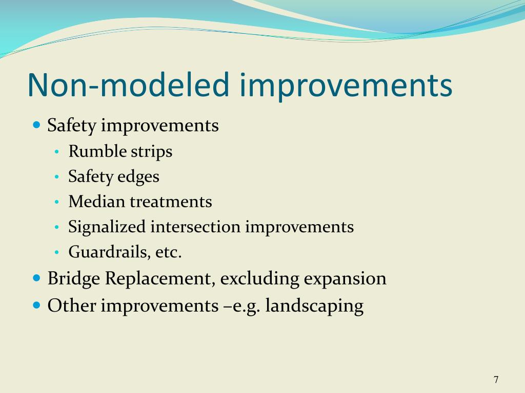 Non-modeled improvements • Safety improvements • Rumble strips • Safety edges • Median treatments • Signalized intersection improvements • Guardrails, etc. • Bridge Replacement, excluding expansion • Other improvements –e.g. landscaping