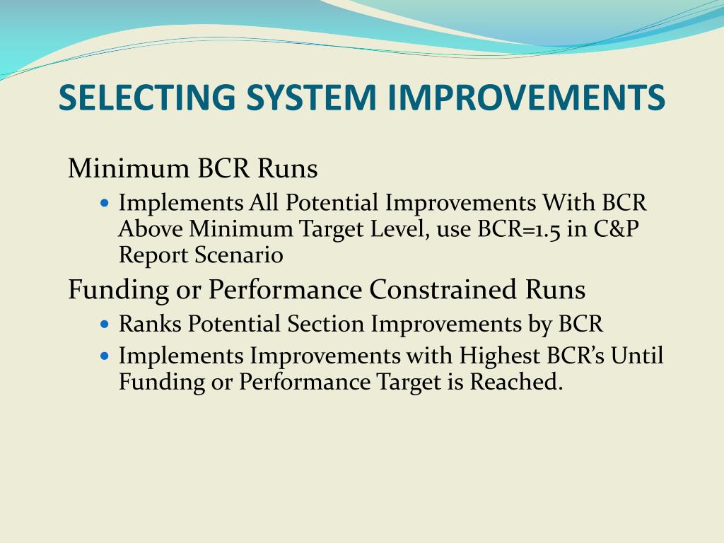 SELECTING SYSTEM IMPROVEMENTS Minimum BCR Runs • Implements All Potential Improvements With BCR Above Minimum Target Level, use BCR=1.5 in C&P Report Scenario Funding or Performance Constrained Runs • Ranks Potential Section Improvements by BCR • Implements Improvements with Highest BCR’s Until Funding or Performance Target is Reached.