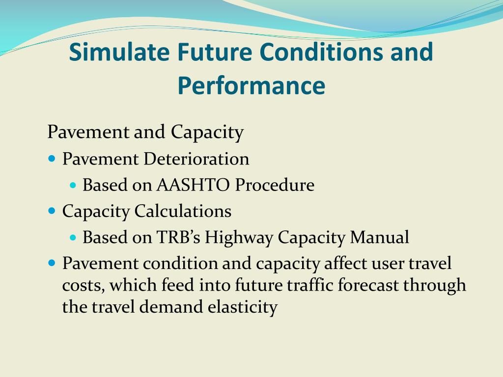 Simulate Future Conditions and Performance Pavement and Capacity • Pavement Deterioration • Based on AASHTO Procedure • Capacity Calculations • Based on TRB’s Highway Capacity Manual • Pavement condition and capacity affect user travel costs, which feed into future traffic forecast through the travel demand elasticity
