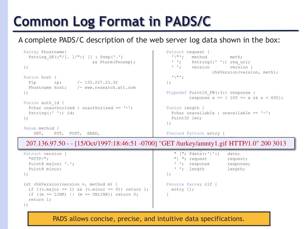 Parray Phostname{ Pstring_SE(:"/[. ]/":) [] : Psep('.') && Pterm(Pnosep); }; Punion host { Pip ip; /- 135.207.23.32 Phostname host; /- www.research.att.com }; Punion auth_id { Pchar unauthorized : unauthorized == '-'; Pstring(:' ':) id; }; Penum method { GET, PUT, POST, HEAD, DELETE, LINK, UNLINK }; Pstruct version { "HTTP/"; Puint8 major; '.'; Puint8 minor; }; int chkVersion(version v, method m) { if ((v.major == 1) && (v.minor == 0)) return 1; if ((m == LINK) || (m == UNLINK)) return 0; return 1; }; Pstruct request { '\"'; method meth; ' '; Pstring(:' ':) req_uri; ' '; version version : chkVersion(version, meth); '\"'; }; Ptypedef Puint16_FW(:3:) response : response x => { 100 <= x && x < 600}; Punion length { Pchar unavailable : unavailable == '-'; Puint32 len; }; PrecordPstruct entry { host client; ' '; auth_id remoteID; ' '; auth_id auth; " ["; Pdate(:']':) date; "] "; request request; ' '; response response; ' '; length length; }; PsourceParray clf { entry []; } Common Log Format in PADS/C A complete PADS/C description of the web server log data shown in the box: 207.136.97.50 - - [15/Oct/1997:18:46:51 -0700] "GET /turkey/amnty1.gif HTTP/1.0" 200 3013 PADS allows concise, precise, and intuitive data specifications.
