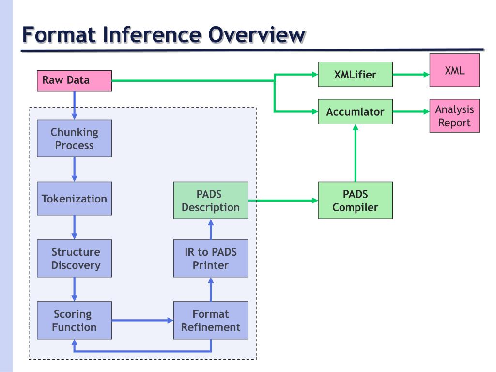 Format Inference Overview XML XMLifier Raw Data Accumlator Analysis Report Chunking Process Tokenization PADS Description PADS Compiler Structure Discovery IR to PADS Printer Scoring Function Format Refinement
