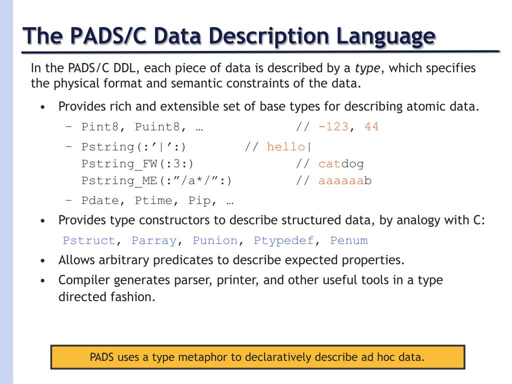 The PADS/C Data Description Language • Provides rich and extensible set of base types for describing atomic data. • Pint8, Puint8, … // -123, 44 • Pstring(:’|’:) // hello| Pstring_FW(:3:) // catdog Pstring_ME(:”/a*/”:) // aaaaaab • Pdate, Ptime, Pip, … • Provides type constructors to describe structured data, by analogy with C: • Pstruct, Parray, Punion, Ptypedef, Penum • Allows arbitrary predicates to describe expected properties. • Compiler generates parser, printer, and other useful tools in a type directed fashion. In the PADS/C DDL, each piece of data is described by a type, which specifies the physical format and semantic constraints of the data. PADS uses a type metaphor to declaratively describe ad hoc data.