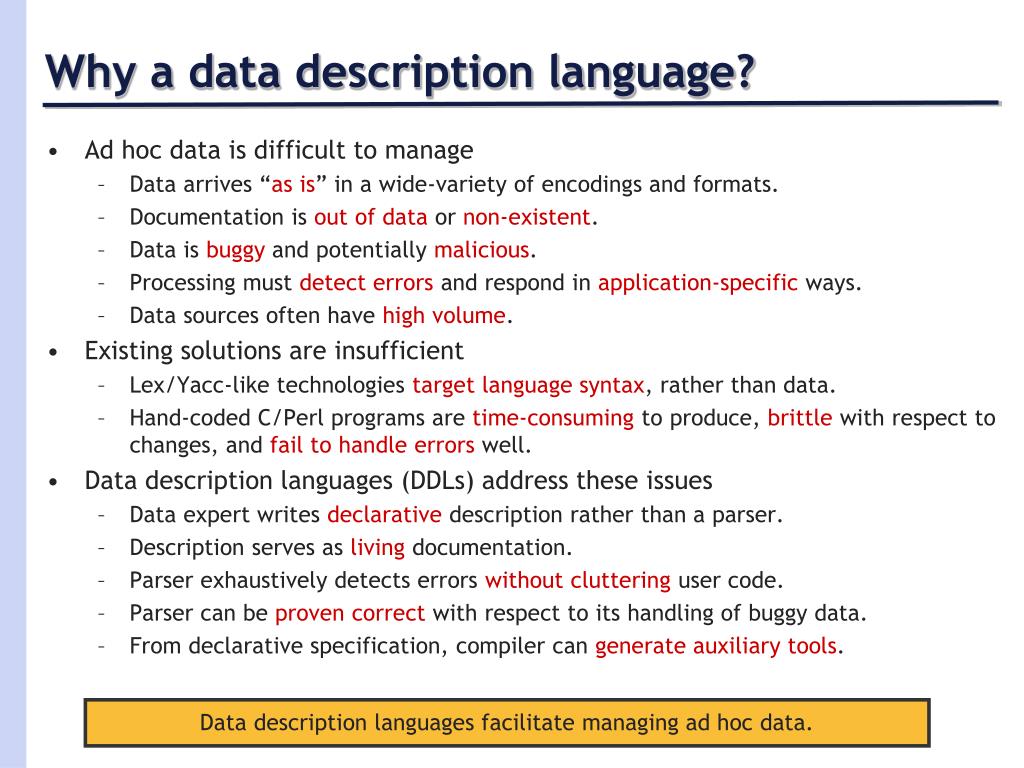 Why a data description language? • Ad hoc data is difficult to manage • Data arrives “as is” in a wide-variety of encodings and formats. • Documentation is out of data or non-existent. • Data is buggy and potentially malicious. • Processing must detect errors and respond in application-specific ways. • Data sources often have high volume. • Existing solutions are insufficient • Lex/Yacc-like technologies target language syntax, rather than data. • Hand-coded C/Perl programs are time-consuming to produce, brittle with respect to changes, and fail to handle errors well. • Data description languages (DDLs) address these issues • Data expert writes declarative description rather than a parser. • Description serves as living documentation. • Parser exhaustively detects errors without cluttering user code. • Parser can be proven correct with respect to its handling of buggy data. • From declarative specification, compiler can generate auxiliary tools. Data description languages facilitate managing ad hoc data.