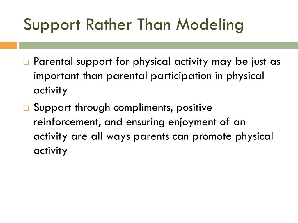Support Rather Than Modeling • Parental support for physical activity may be just as important than parental participation in physical activity • Support through compliments, positive reinforcement, and ensuring enjoyment of an activity are all ways parents can promote physical activity