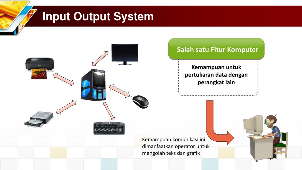 Input Output System Salah satuFiturKomputer Kemampuanuntukpertukaran data denganperangkat lain Kemampuankomunikasiinidimanfaatkan operator untukmengolahteksdangrafik
