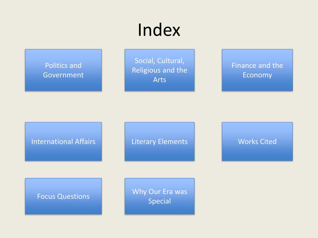 Index Politics and Government Social, Cultural, Religious and the Arts Finance and the Economy International Affairs Literary Elements Works Cited Focus Questions Why Our Era was Special