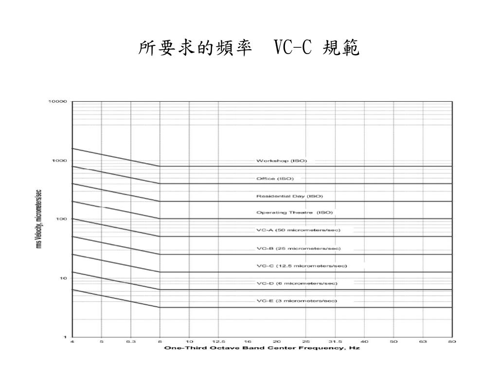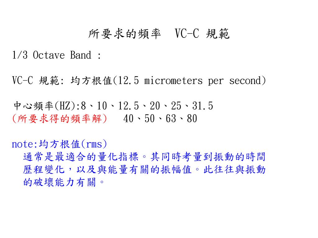 所要求的頻率 VC-C 規範 1/3 Octave Band : VC-C 規範: 均方根值(12.5 micrometers per second) 中心頻率(HZ):8、10、12.5、20、25、31.5 (所要求得的頻率解) 40、50、63、80 note:均方根值(rms) 通常是最適合的量化指標。其同時考量到振動的時間 歷程變化,以及與能量有關的振幅值。此往往與振動 的破壞能力有關。