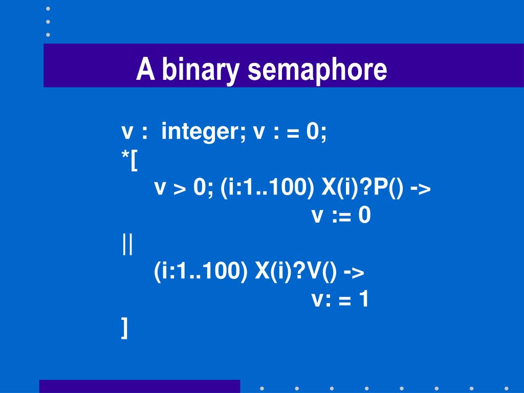 A binary semaphore v : integer; v : = 0;*[ v > 0; (i:1..100) X(i)?P() -> v := 0 || (i:1..100) X(i)?V() -> v: = 1]