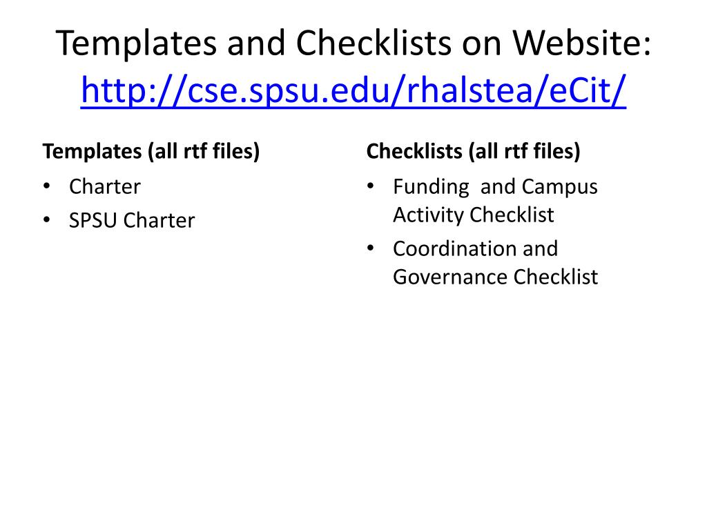 Templates and Checklists on Website: http://cse.spsu.edu/rhalstea/eCit/ Templates (all rtf files) Checklists (all rtf files) Funding and Campus Activity Checklist Coordination and Governance Checklist • Charter • SPSU Charter
