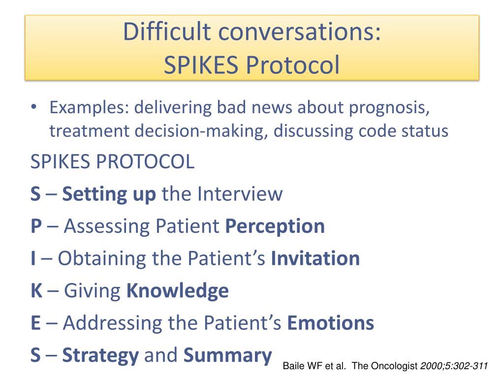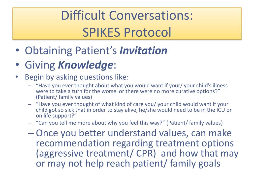 Difficult conversations:SPIKES Protocol • Setting up the interview: Establish appropriate setting • Give yourself time and be prepared! • MUCH easier to bring up at a time when patient is not in “crisis” or declining • Sit at patient or parent level • Appropriate people present? • Acknowledge difficulty of topic/ conversation • Assessing Patient Perception • Ask patient/ family about their understanding of current status and what they expect or hope for long term outcome