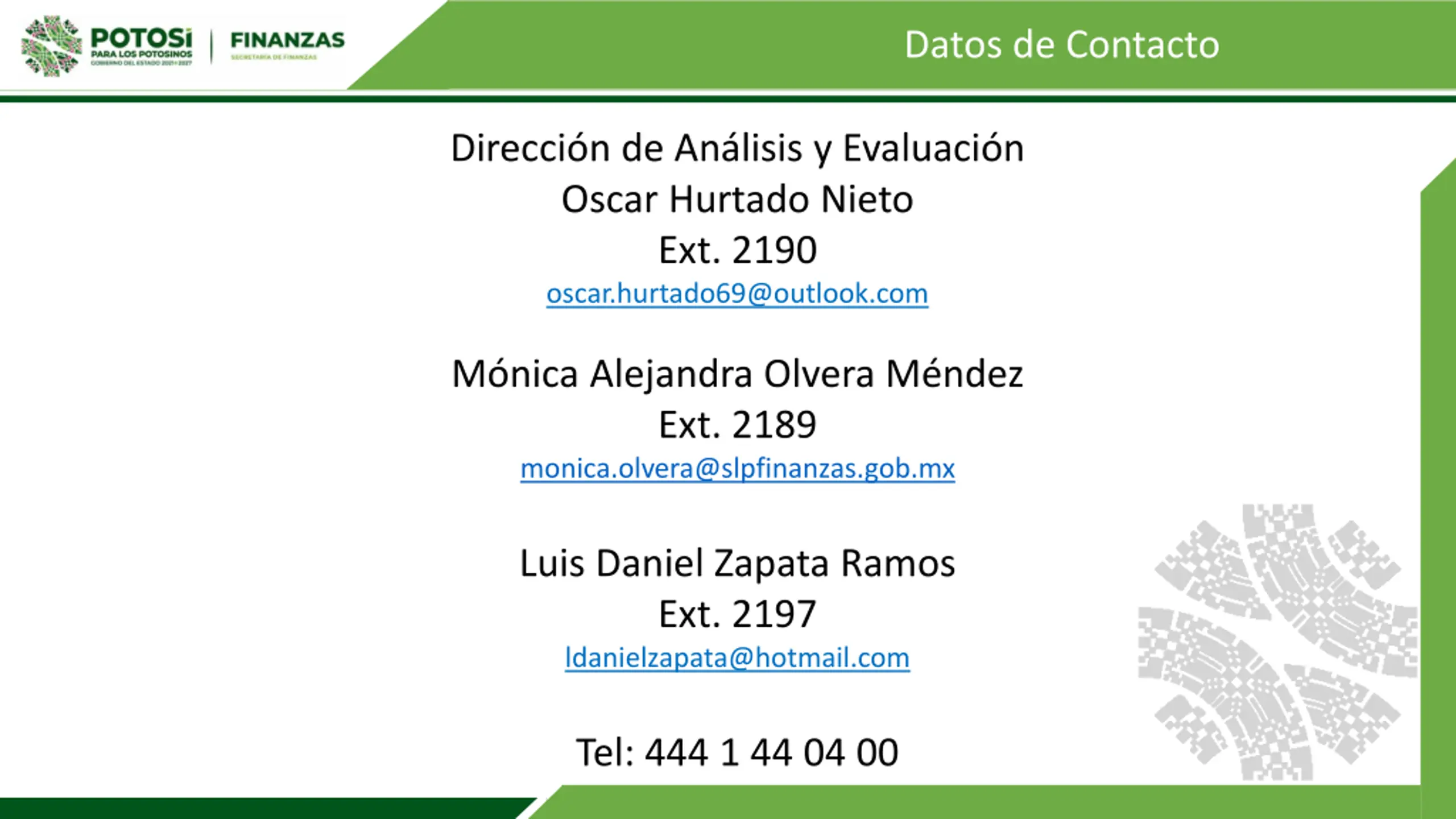 Datos de Contacto Dirección de Análisis y Evaluación Oscar Hurtado Nieto Ext. 2190 oscar.hurtado69@outlook.com Mónica Alejandra Olvera Méndez Ext. 2189 monica.olvera@slpfinanzas.gob.mx Luis Daniel Zapata Ramos Ext. 2197 ldanielzapata@hotmail.com Tel: 444 1 44 04 00