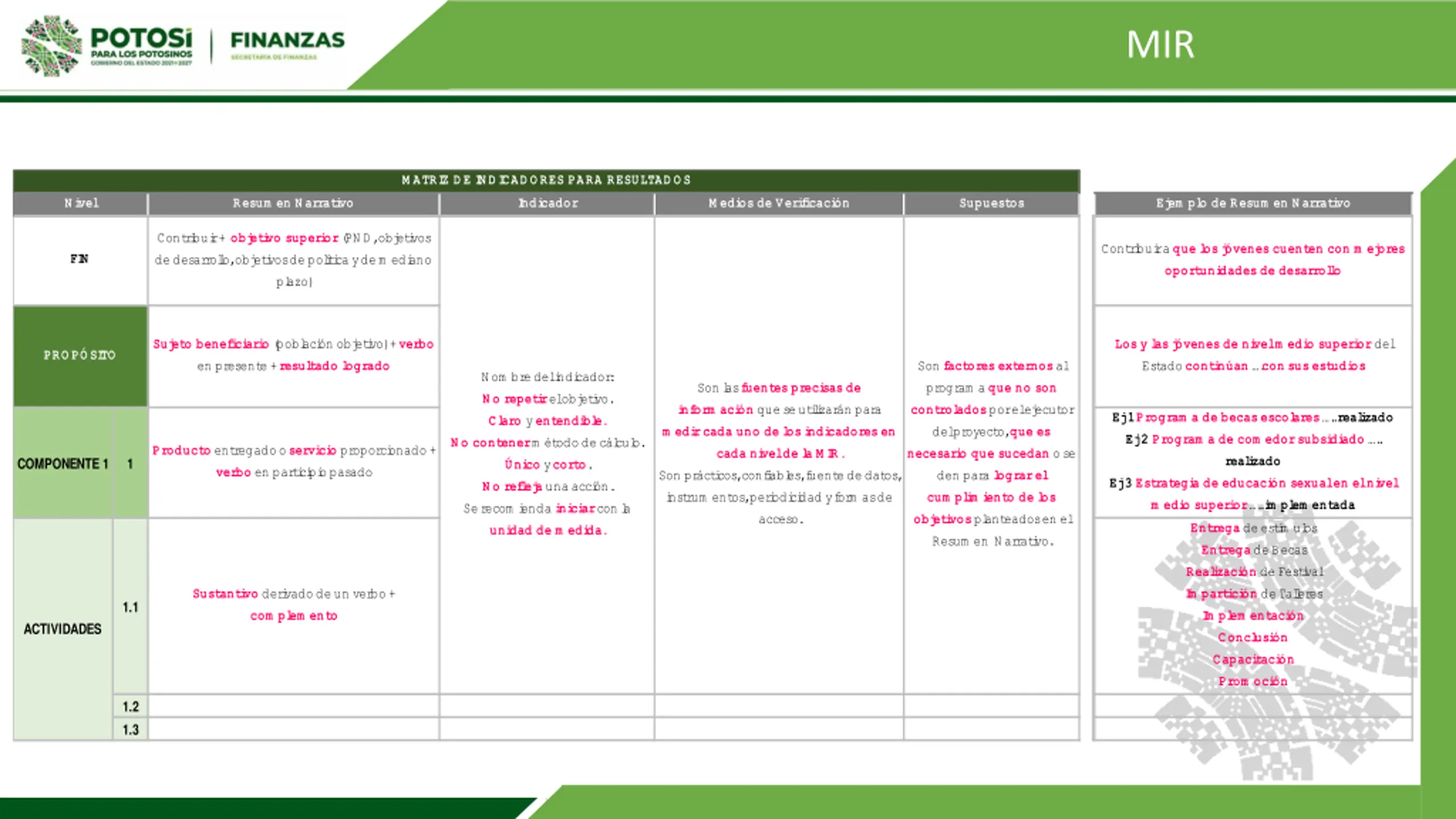 MIR M ATRI Z D E I N D I CAD O RES PARA RESULTAD O S N i vel Resum en N arrati vo I ndi cador M edi os de Veri fi caci ón Supuestos Ej em pl o de Resum en N arrati vo Contri bui r + obj eti vo superi or ( PN D , obj eti vos de desarrol l o, obj eti vos de pol í ti ca y de m edi ano pl azo) Contri bui r a que l os j óvenes cuenten con m ej ores oportuni dades de desarrol l o FI N Suj eto benefi ci ari o ( pobl aci ón obj eti vo) + verbo en presente + resul tado l ogrado Los y l as j óvenes de ni vel m edi o superi or del Estado conti núan …. consus estudi os PRO PÓ SI TO Son factores externos al program a que no son control ados por el ej ecutor del proyecto, que es necesari o que sucedan o se den para l ograr el cum pl i m i ento de l os obj eti vos pl anteados en el Resum en N arrati vo. N om bre del i ndi cador: N o repeti r el obj eti vo. Cl aro y entendi bl e. N o contener m étodo de cál cul o. Úni co y corto. N o refl ej a una acci ón. Se recom i enda i ni ci ar con l a uni dad de m edi da. Son l as fuentes preci sas de i nform aci ón que se uti l i zarán para m edi r cada uno de l os i ndi cadores en cada ni vel de l a M I R. Son prácti cos, conf i abl es, f uente de datos, i nstrum entos, peri odi ci dad y f orm as de acceso. Ej 1 Program a de becas escol ares …. .real i zado Ej 2 Program a de com edor subsi di ado …. . real i zado Ej 3 Estrategi a de educaci ón sexual en el ni vel m edi o superi or …. . i m pl em entada Producto entregado o servi ci o proporci onado + verbo en parti ci pi o pasado COMPONENTE 1 1 Entrega de estí m ul os Entrega de Becas Real i zaci ón de Festi val I m parti ci ón de Tal l eres I m pl em entaci ón Concl usi ón Capaci taci ón Prom oci ón Sustanti vo deri vado de un verbo + com pl em ento 1.1 ACTIVIDADES 1.2 1.3