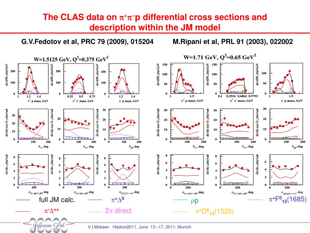 The CLAS data on p+p-p differential cross sections and description within the JM model G.V.Fedotov et al, PRC 79 (2009), 015204 M.Ripani et al, PRL 91 (2003), 022002 p+F015(1685) full JM calc. p+D0 rp p-D++ 2p direct p+D013(1520)