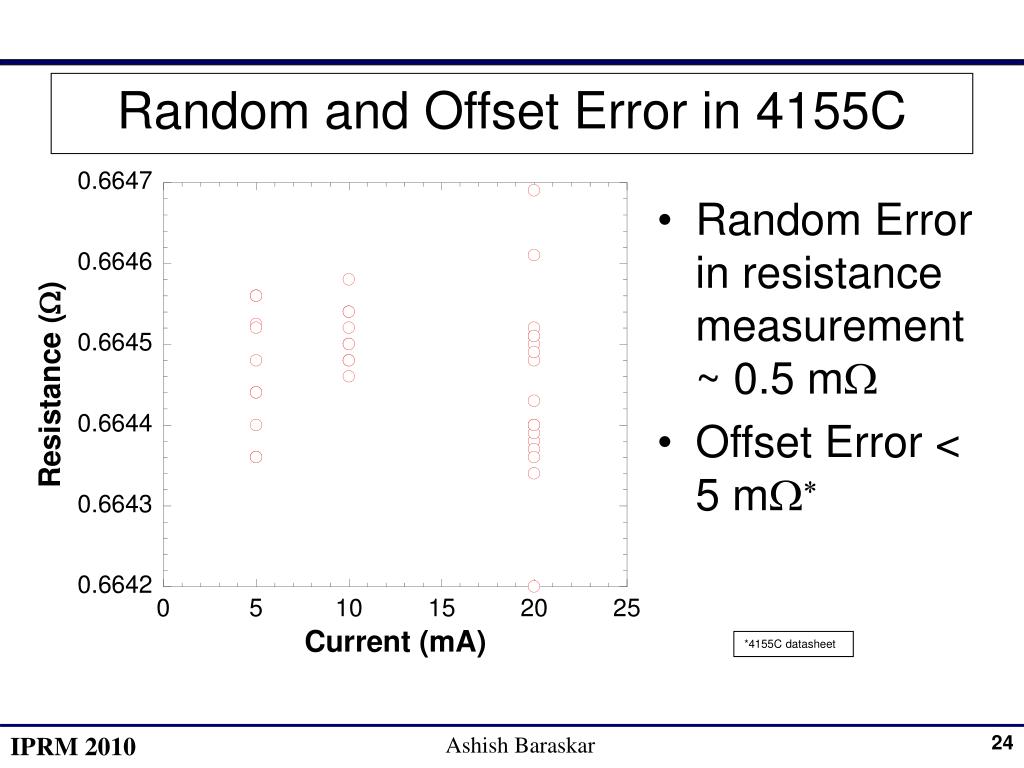 Random and Offset Error in 4155C • Random Error in resistance measurement ~ 0.5 mW • Offset Error < 5 mW* *4155C datasheet Ashish Baraskar