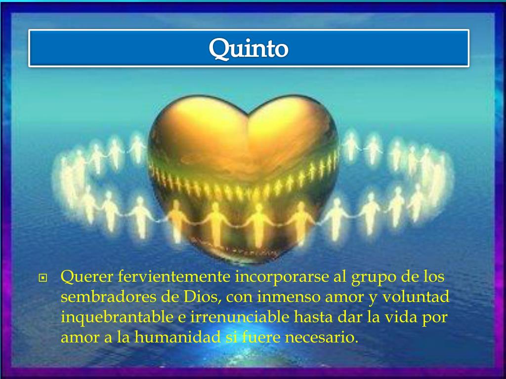 Quinto • Querer fervientemente incorporarse al grupo de los sembradores de Dios, con inmenso amor y voluntad inquebrantable e irrenunciable hasta dar la vida por amor a la humanidad si fuere necesario.