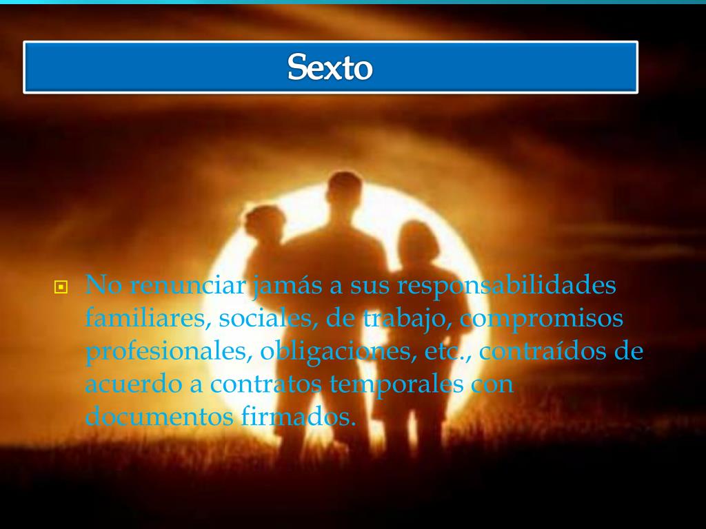 Sexto • No renunciar jamás a sus responsabilidades familiares, sociales, de trabajo, compromisos profesionales, obligaciones, etc., contraídos de acuerdo a contratos temporales con documentos firmados.