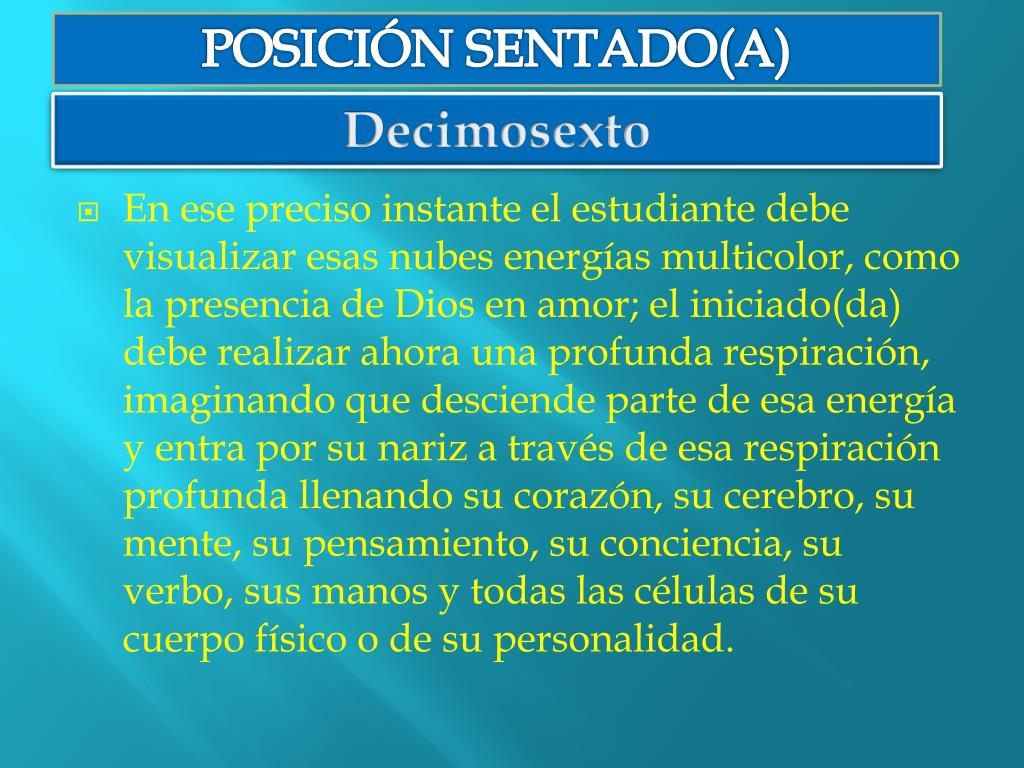 POSICIÓN SENTADO(A) Decimosexto • En ese preciso instante el estudiante debe visualizar esas nubes energías multicolor, como la presencia de Dios en amor; el iniciado(da) debe realizar ahora una profunda respiración, imaginando que desciende parte de esa energía y entra por su nariz a través de esa respiración profunda llenando su corazón, su cerebro, su mente, su pensamiento, su conciencia, su verbo, sus manos y todas las células de su cuerpo físico o de su personalidad.