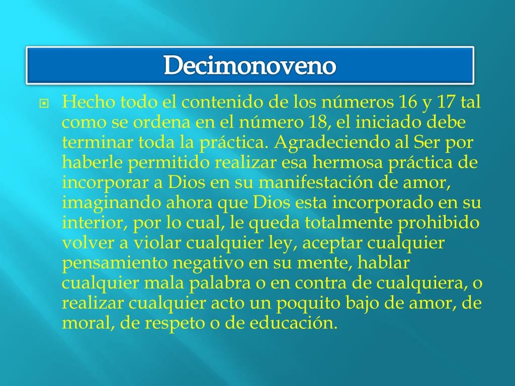 Decimonoveno • Hecho todo el contenido de los números 16 y 17 tal como se ordena en el número 18, el iniciado debe terminar toda la práctica. Agradeciendo al Ser por haberle permitido realizar esa hermosa práctica de incorporar a Dios en su manifestación de amor, imaginando ahora que Dios esta incorporado en su interior, por lo cual, le queda totalmente prohibido volver a violar cualquier ley, aceptar cualquier pensamiento negativo en su mente, hablar cualquier mala palabra o en contra de cualquiera, o realizar cualquier acto un poquito bajo de amor, de moral, de respeto o de educación.
