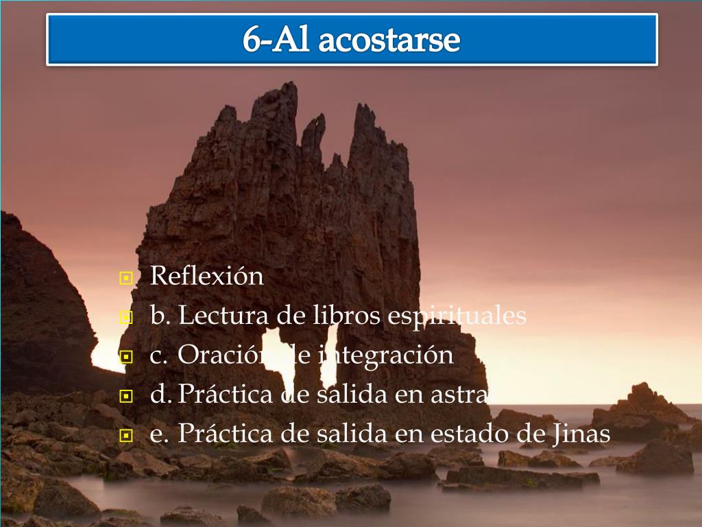 6-Al acostarse • Reflexión • b. Lectura de libros espirituales • c. Oración de integración • d. Práctica de salida en astral • e. Práctica de salida en estado de Jinas