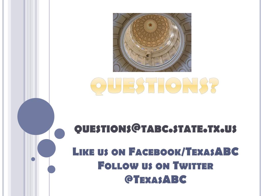 Questions? questions@tabc.state.tx.usLike us on Facebook/TexasABCFollow us on Twitter@TexasABC