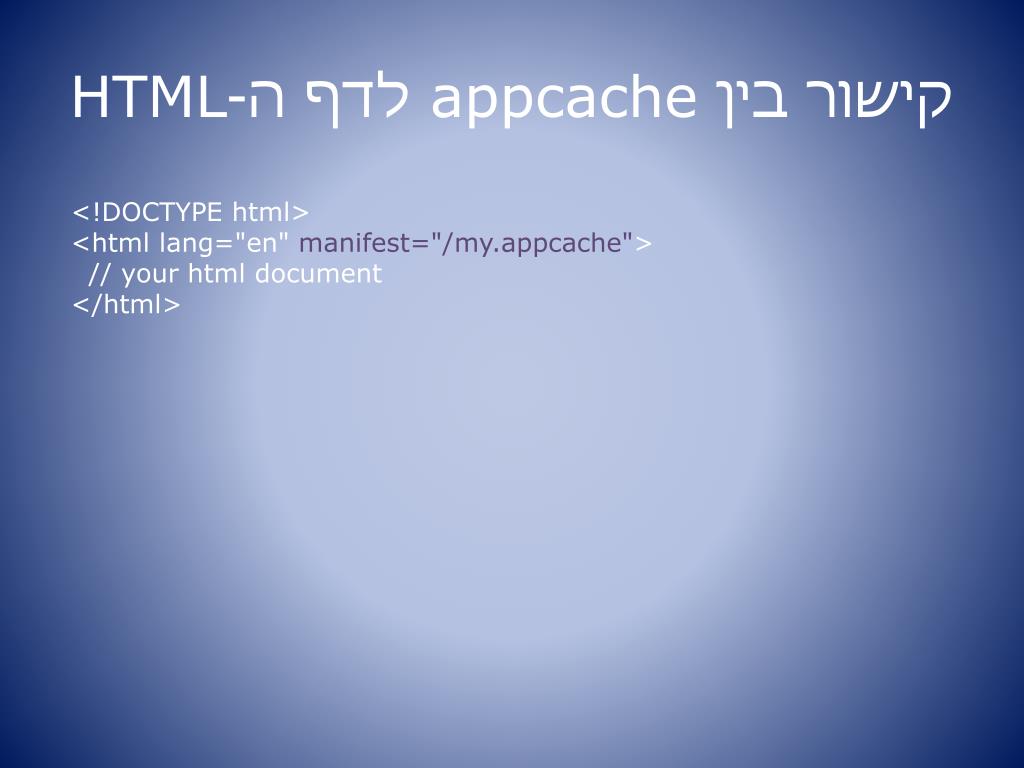 קישור בין appcache לדף ה-HTML <!DOCTYPE html> <html lang="en" manifest="/my.appcache"> // your html document </html>