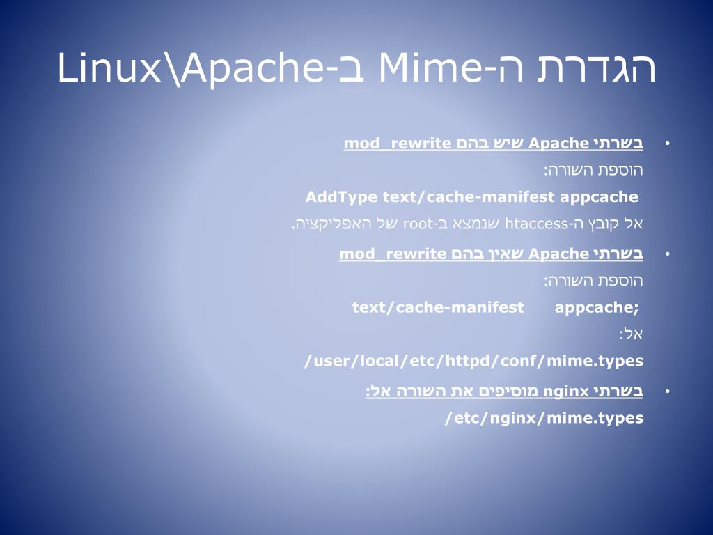 הגדרת ה-Mime ב-Linux\Apache • בשרתי Apache שיש בהם mod_rewriteהוספת השורה:AddType text/cache-manifest appcacheאל קובץ ה-htaccess שנמצא ב-root של האפליקציה. • בשרתי Apache שאין בהם mod_rewriteהוספת השורה:text/cache-manifest appcache;אל: /user/local/etc/httpd/conf/mime.types • בשרתי nginx מוסיפים את השורה אל:/etc/nginx/mime.types