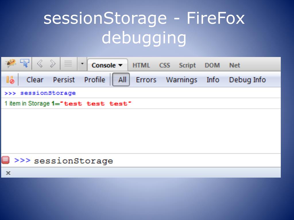 sessionStorage – API אחסון נתונים: sessionStorage.setItem('KEY', 'VALUE'); שליפת נתון: varvalue = sessionStorage.getItem('KEY'); מחיקת נתון: sessionStorage.clear('KEY'); מחיקת כל הנתונים: sessionStorage.clear();