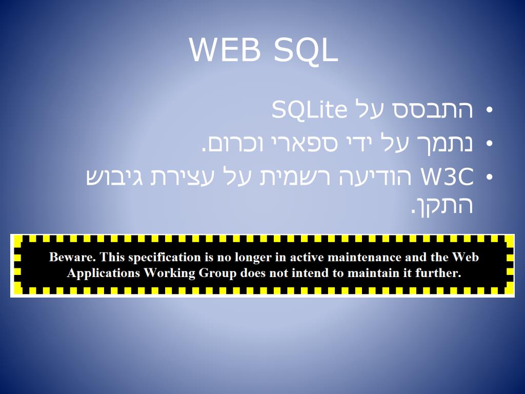 WEB SQL • התבסס על SQLite • נתמך על ידי ספארי וכרום. • W3C הודיעה רשמית על עצירת גיבוש התקן.