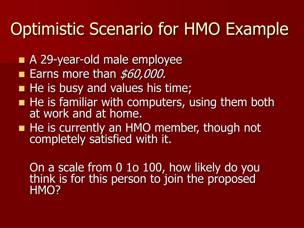 Optimistic Scenario for HMO Example • A 29‑year‑old male employee • Earns more than $60,000. • He is busy and values his time; • He is familiar with computers, using them both at work and at home. • He is currently an HMO member, though not completely satisfied with it. On a scale from 0 1o 100, how likely do you think is for this person to join the proposed HMO?