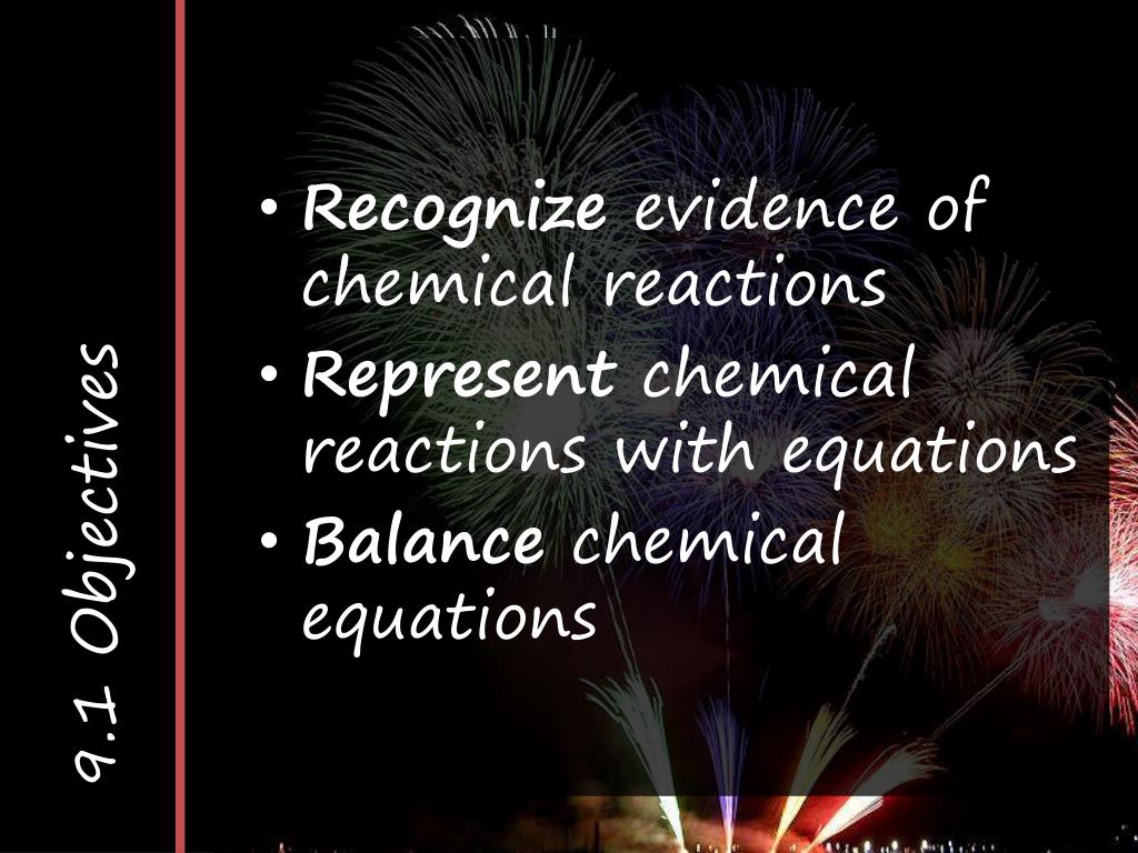 9.1 Objectives Recognize evidence of chemical reactions Represent chemical reactions with equations Balance chemical equations