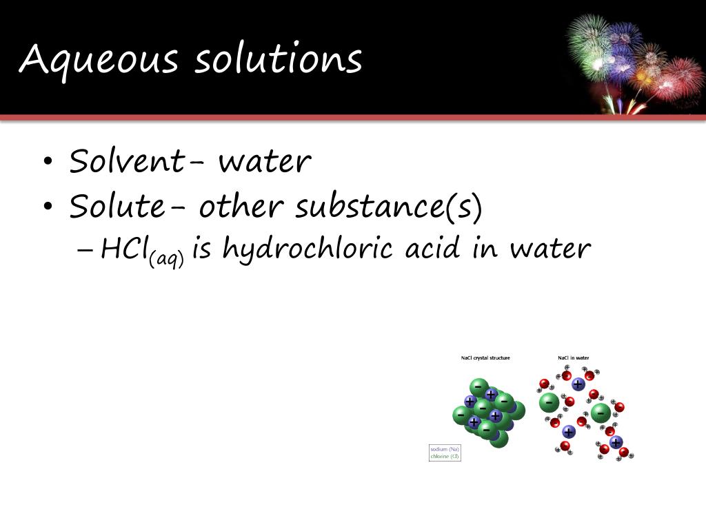 Aqueous solutions • Solvent- water • Solute- other substance(s) • HCl(aq) is hydrochloric acid in water