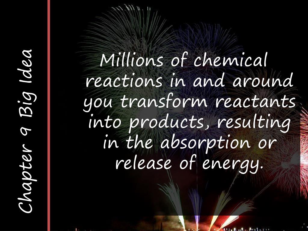 Chapter 9 Big Idea Millions of chemical reactions in and around you transform reactants into products, resulting in the absorption or release of energy.