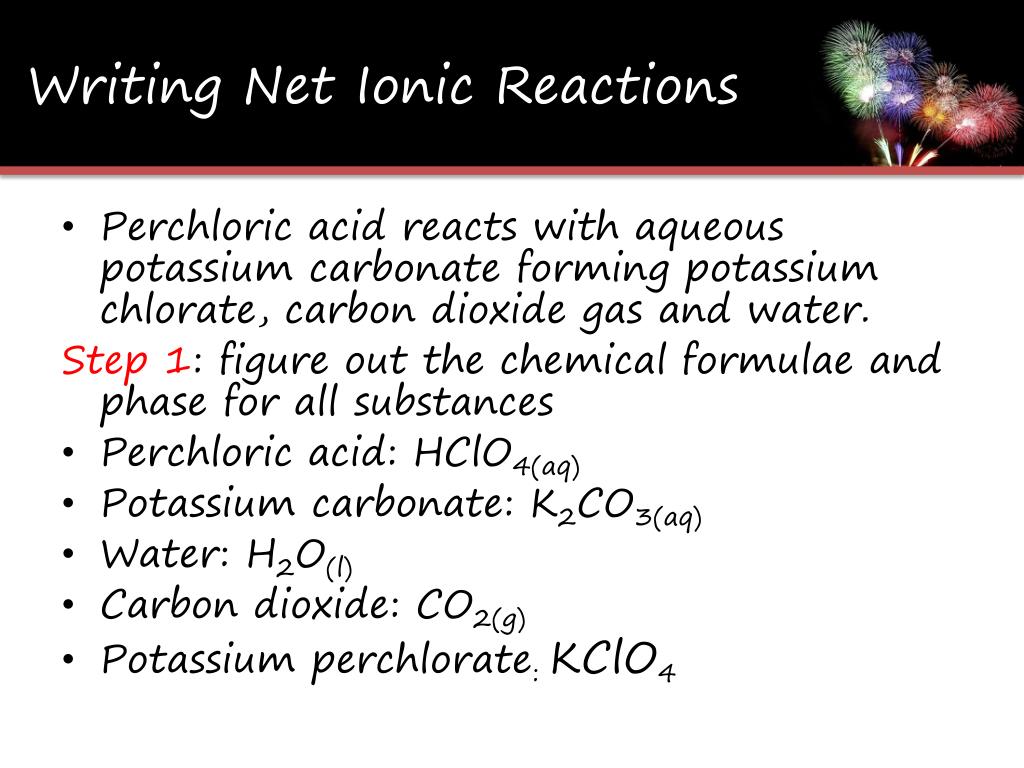 Writing Net Ionic Reactions • Perchloric acid reacts with aqueous potassium carbonate forming potassium chlorate, carbon dioxide gas and water. Step 2: write the skeletal equation HClO4(aq)+K2CO3(aq) H2O(l)+CO2(g)+KClO4(aq)