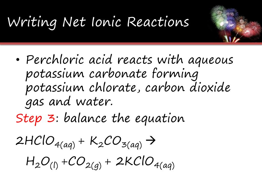 Writing Net Ionic Reactions • Perchloric acid reacts with aqueous potassium carbonate forming potassium chlorate, carbon dioxide gas and water. Step 3: balance the equation 2HClO4(aq) + K2CO3(aq) H2O(l) +CO2(g) + 2KClO4(aq)