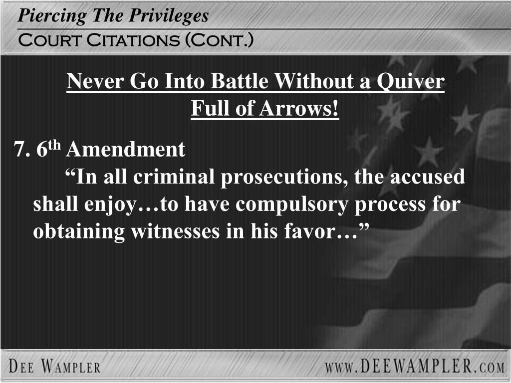 Piercing The Privileges Court Citations (Cont.) Never Go Into Battle Without a Quiver Full of Arrows! 7. 6th Amendment “In all criminal prosecutions, the accused shall enjoy…to have compulsory process for obtaining witnesses in his favor…”