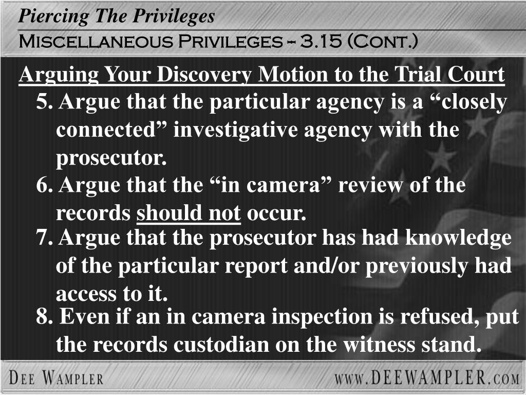 Piercing The Privileges Miscellaneous Privileges -- 3.15 Arguing Your Discovery Motion to the Trial Court 1. Argue that the statute conferring the privilege is conditional and not absolute. 2. Be as specific as possible as to what record you’re wanting and what specifically is in the record that will assist you. 3. The prosecutor will argue you are pursuing a “scorched earth” battlefield, sacrificed to mindless overzealous representation. 4. Make an offer of proof. Put the prosecutor and/or records custodian on the witness stand.