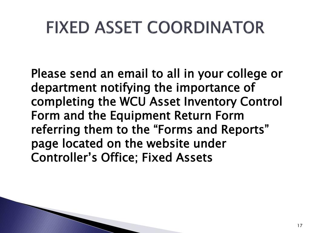 FIXED ASSET COORDINATOR Please send an email to all in your college or department notifying the importance of completing the WCU Asset Inventory Control Form and the Equipment Return Form referring them to the “Forms and Reports” page located on the website under Controller’s Office; Fixed Assets