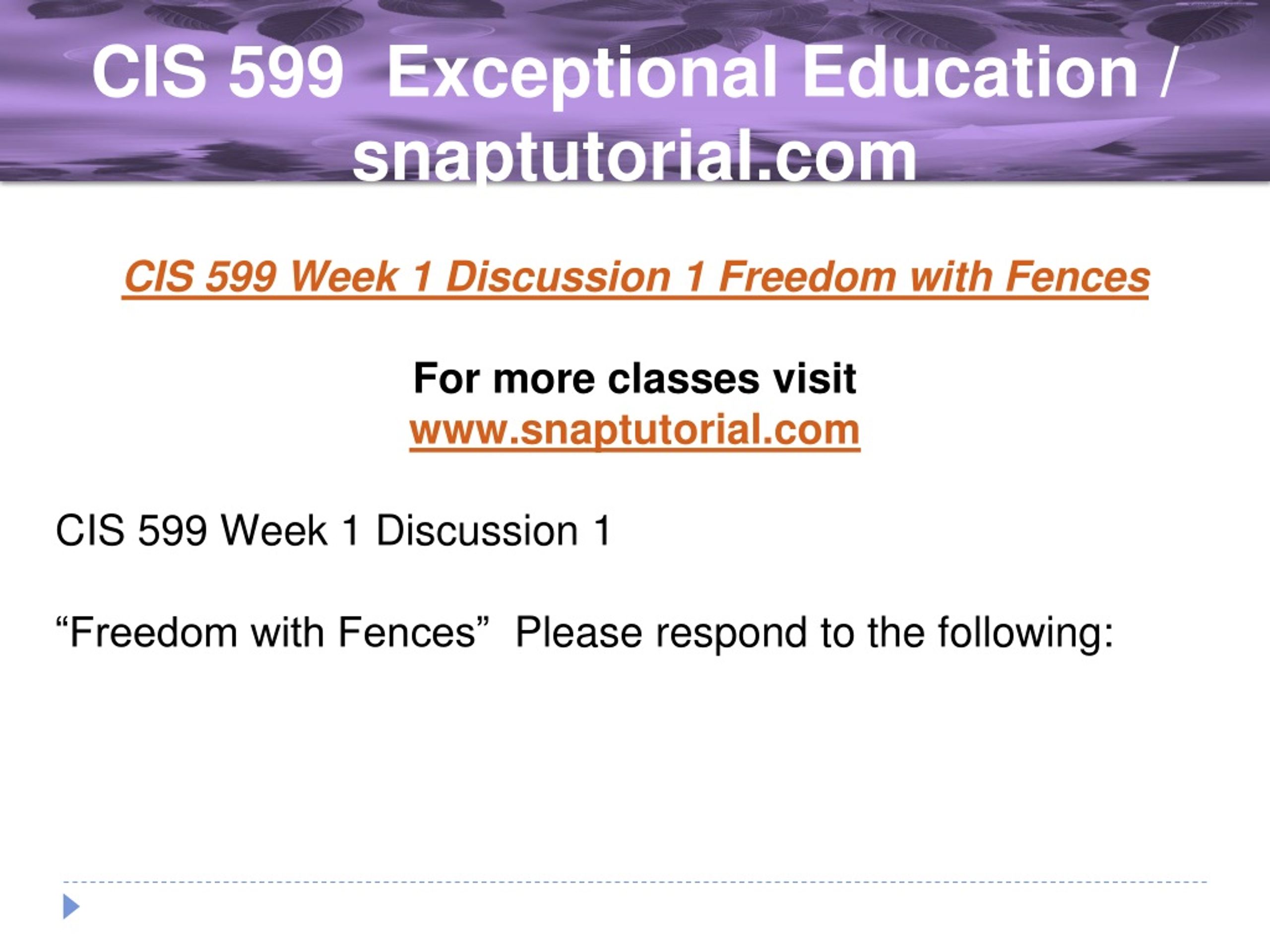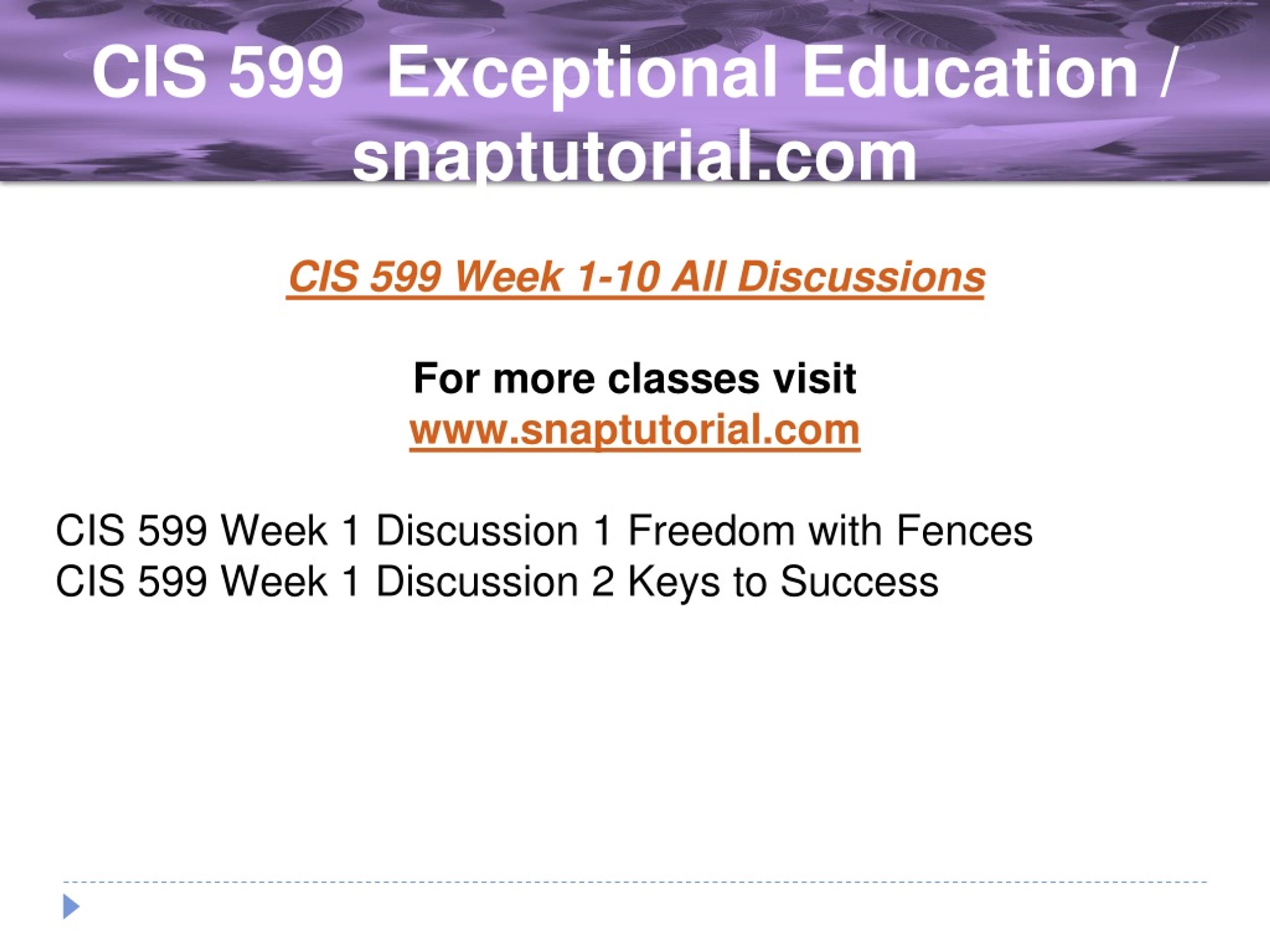 CIS 599 Exceptional Education / snaptutorial.com CIS 599 Week 1-10 All Discussions For more classes visit www.snaptutorial.com CIS 599 Week 1 Discussion 1 Freedom with Fences CIS 599 Week 1 Discussion 2 Keys to Success