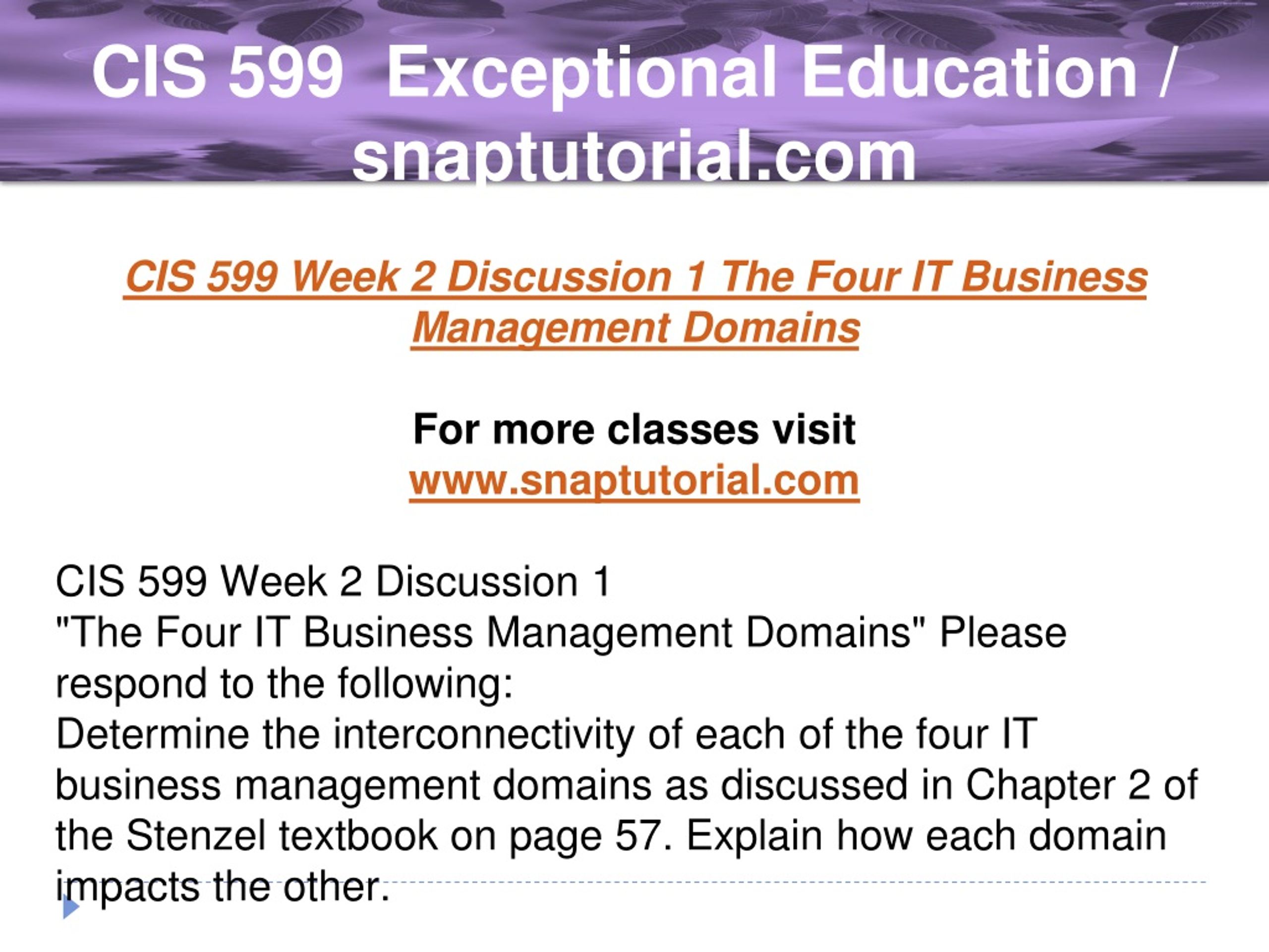 CIS 599 Exceptional Education / snaptutorial.com CIS 599 Week 2 Discussion 1 The Four IT Business Management Domains For more classes visit www.snaptutorial.com CIS 599 Week 2 Discussion 1 "The Four IT Business Management Domains" Please respond to the following: Determine the interconnectivity of each of the four IT business management domains as discussed in Chapter 2 of the Stenzel textbook on page 57. Explain how each domain impacts the other.