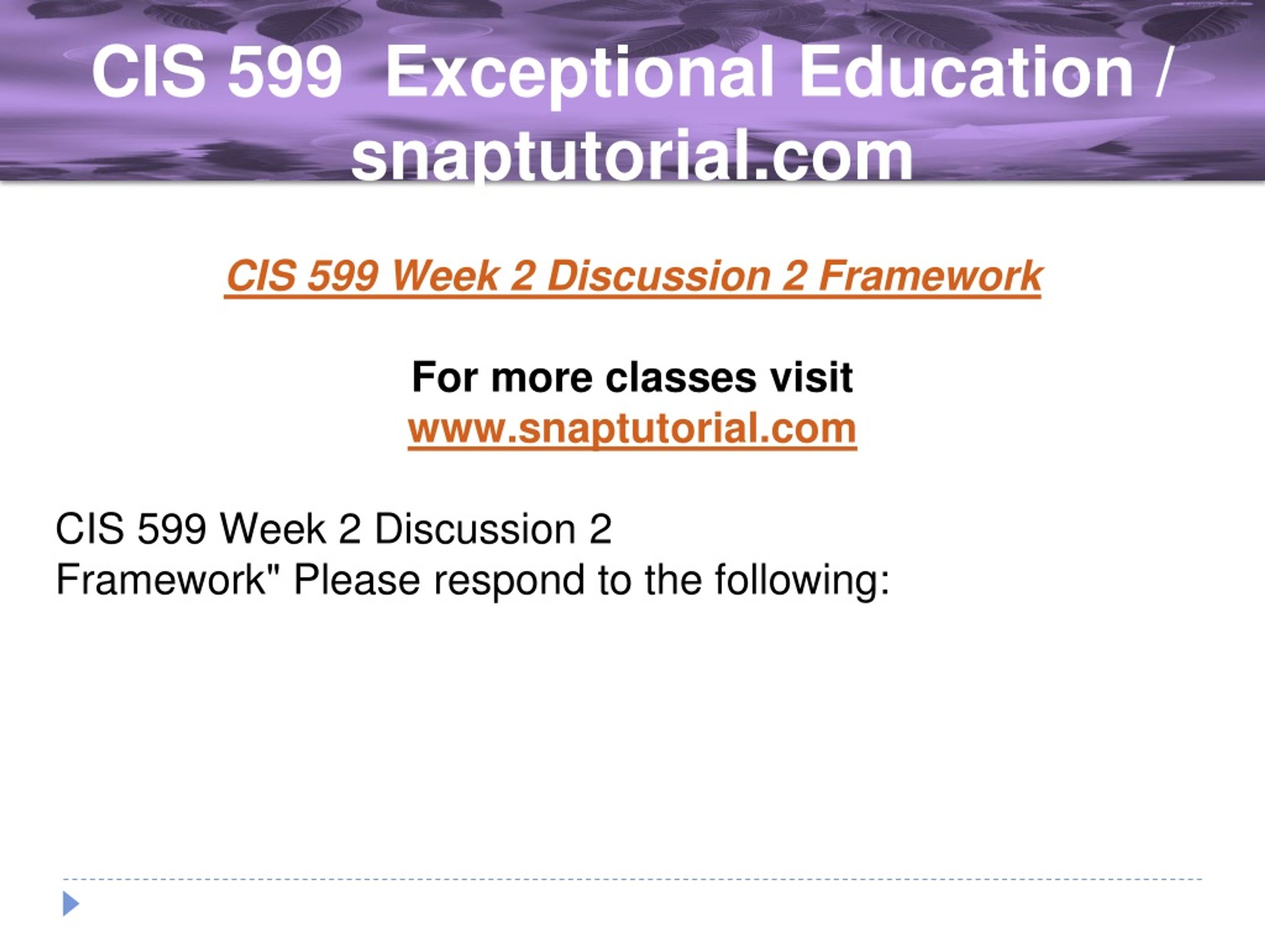 CIS 599 Exceptional Education / snaptutorial.com CIS 599 Week 2 Discussion 2 Framework For more classes visit www.snaptutorial.com CIS 599 Week 2 Discussion 2 Framework" Please respond to the following: