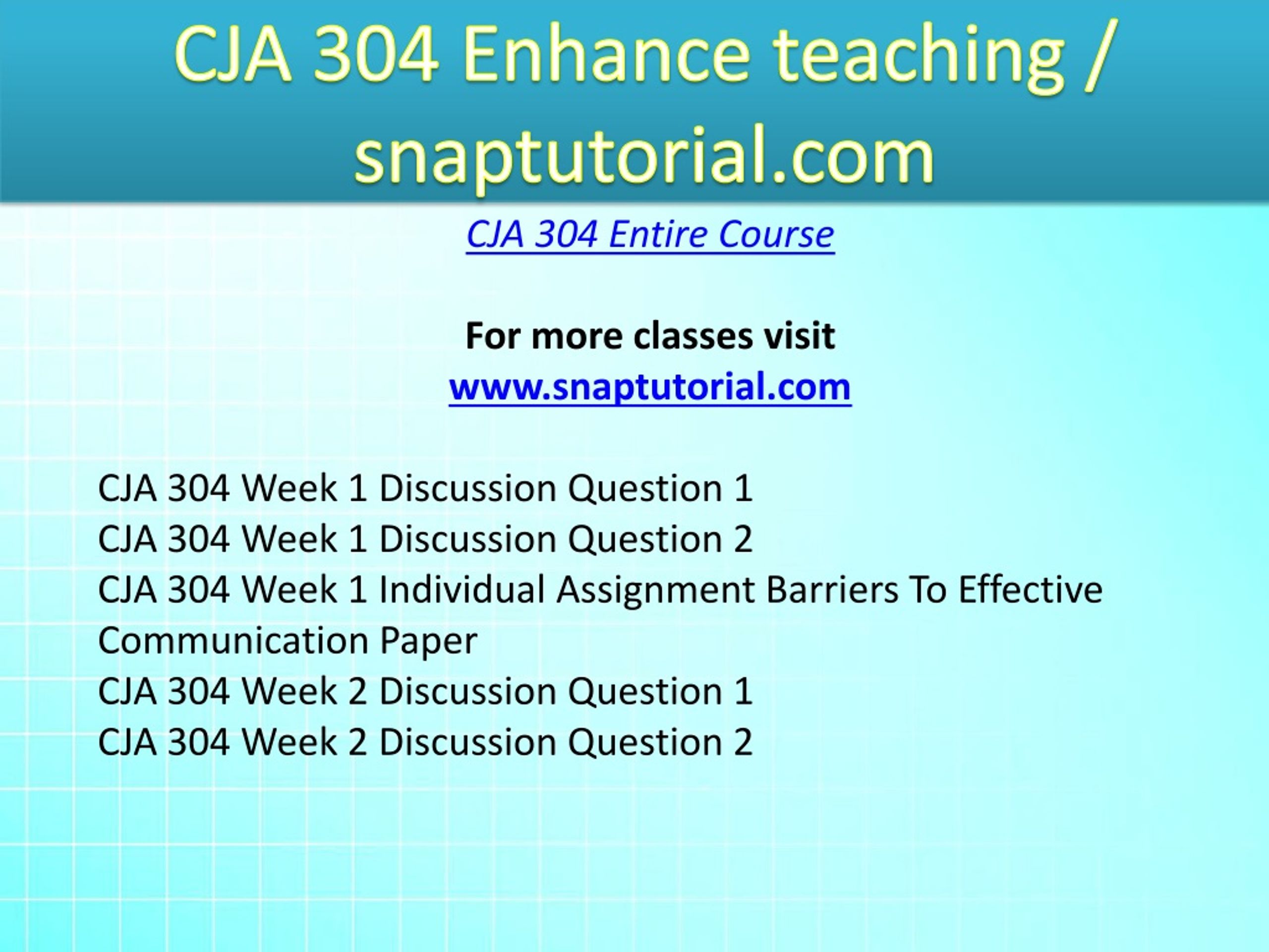 CJA 304 Enhance teaching / snaptutorial.com CJA 304 Entire Course For more classes visit www.snaptutorial.com CJA 304 Week 1 Discussion Question 1 CJA 304 Week 1 Discussion Question 2 CJA 304 Week 1 Individual Assignment Barriers To Effective Communication Paper CJA 304 Week 2 Discussion Question 1 CJA 304 Week 2 Discussion Question 2
