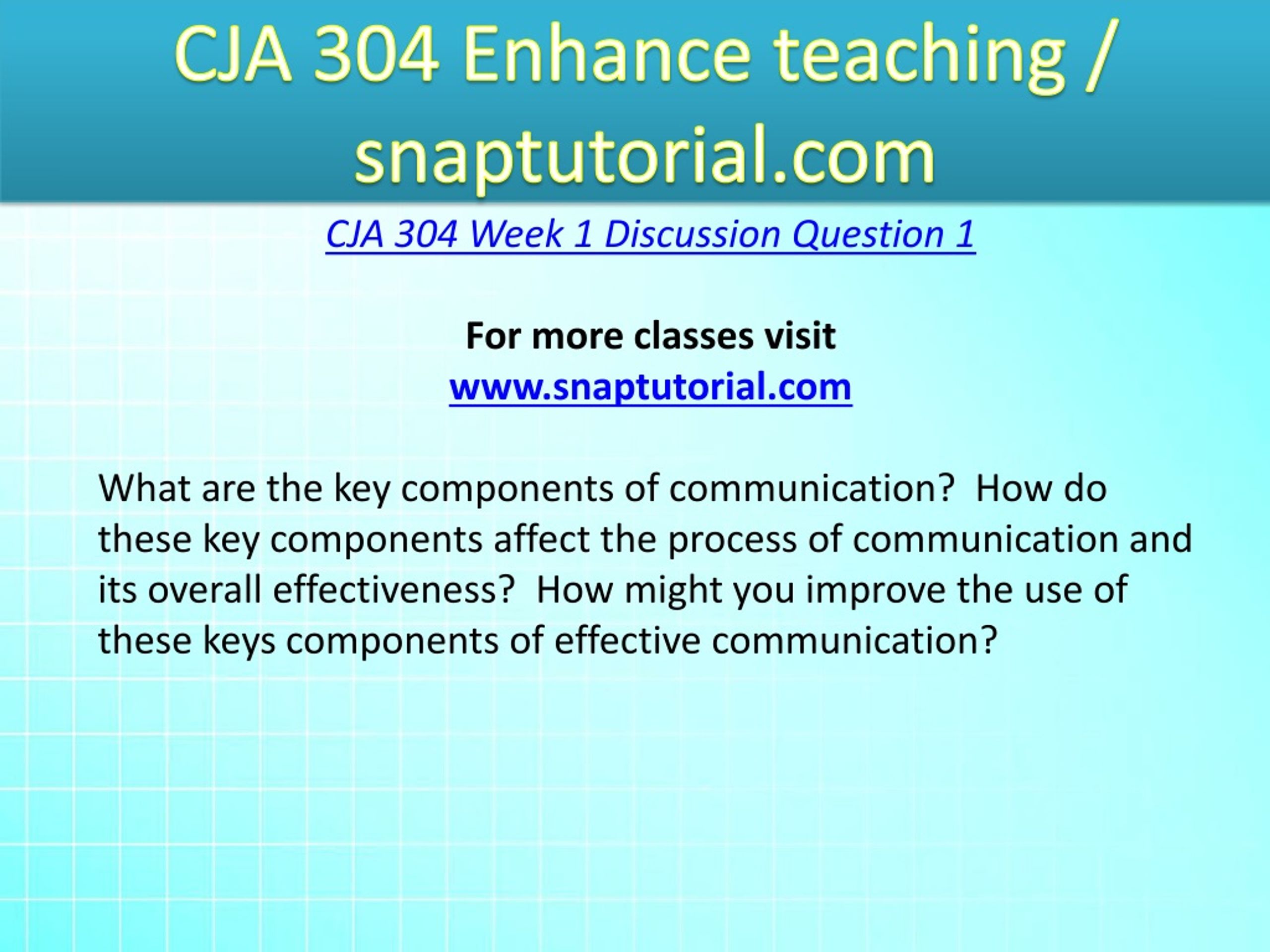 CJA 304 Enhance teaching / snaptutorial.com CJA 304 Week 1 Discussion Question 1 For more classes visit www.snaptutorial.com What are the key components of communication? How do these key components affect the process of communication and its overall effectiveness? How might you improve the use of these keys components of effective communication?